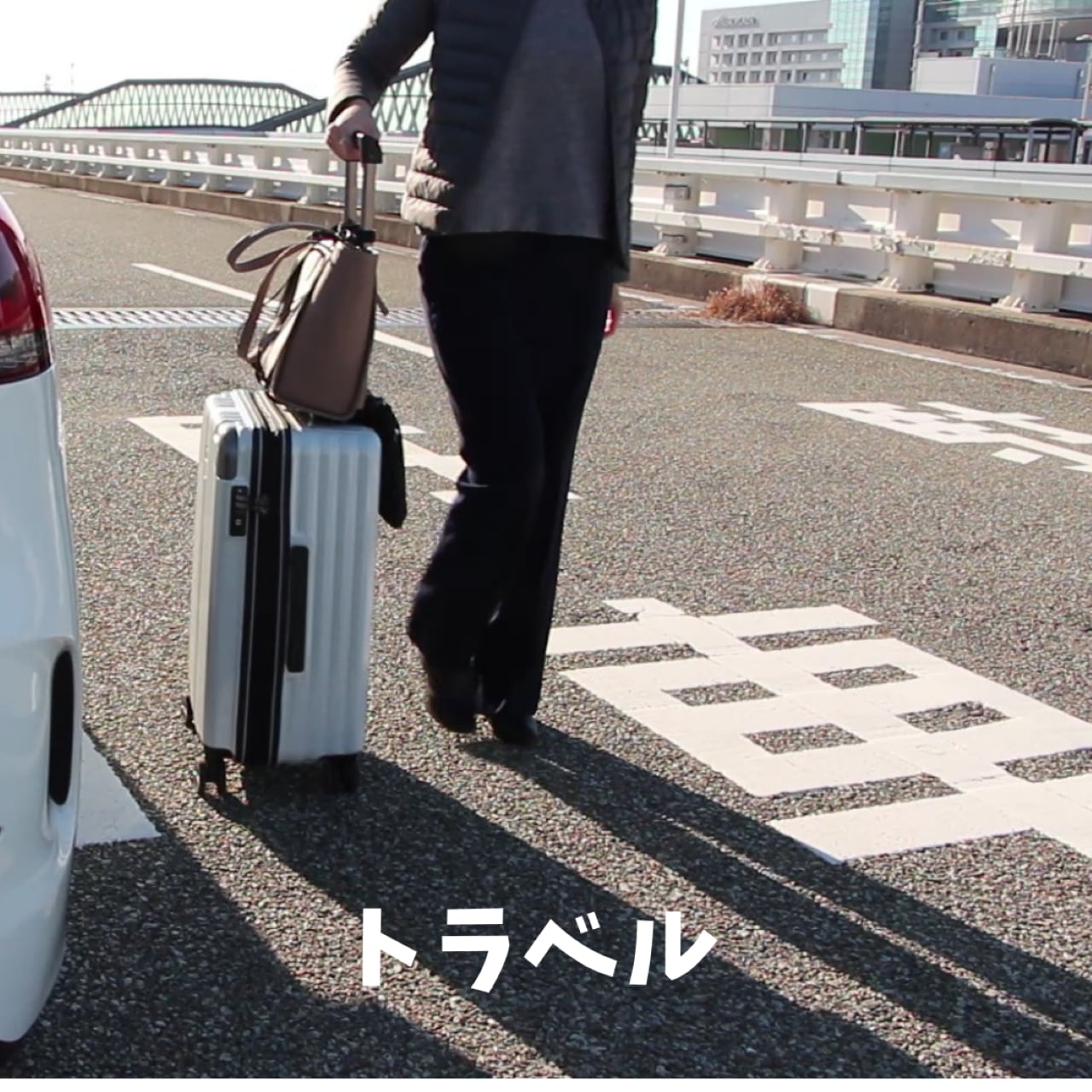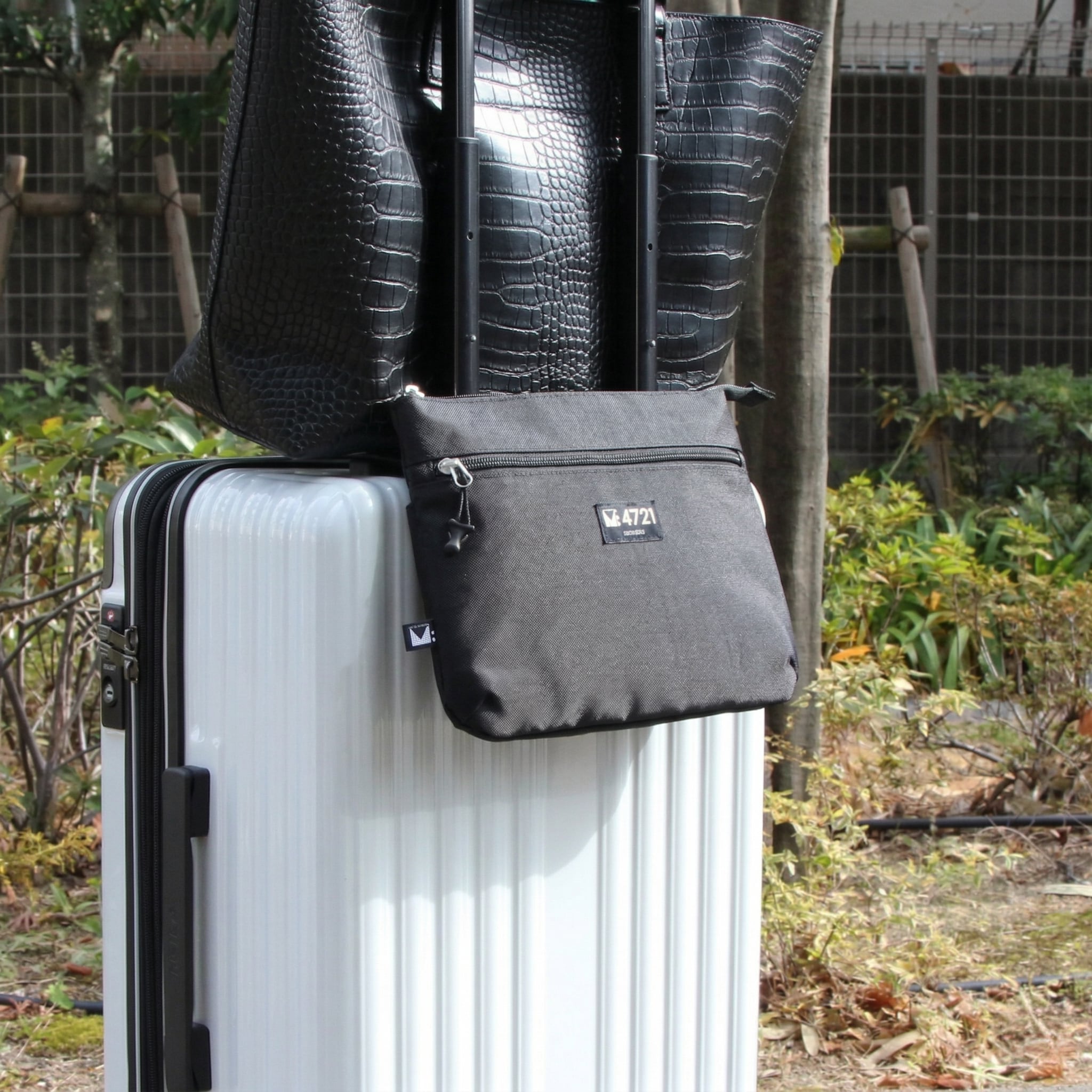 ポシェットのショルダ-ベルトを使って、キャリケ-スの上に置いたバッグなどを安定して固定することができます。