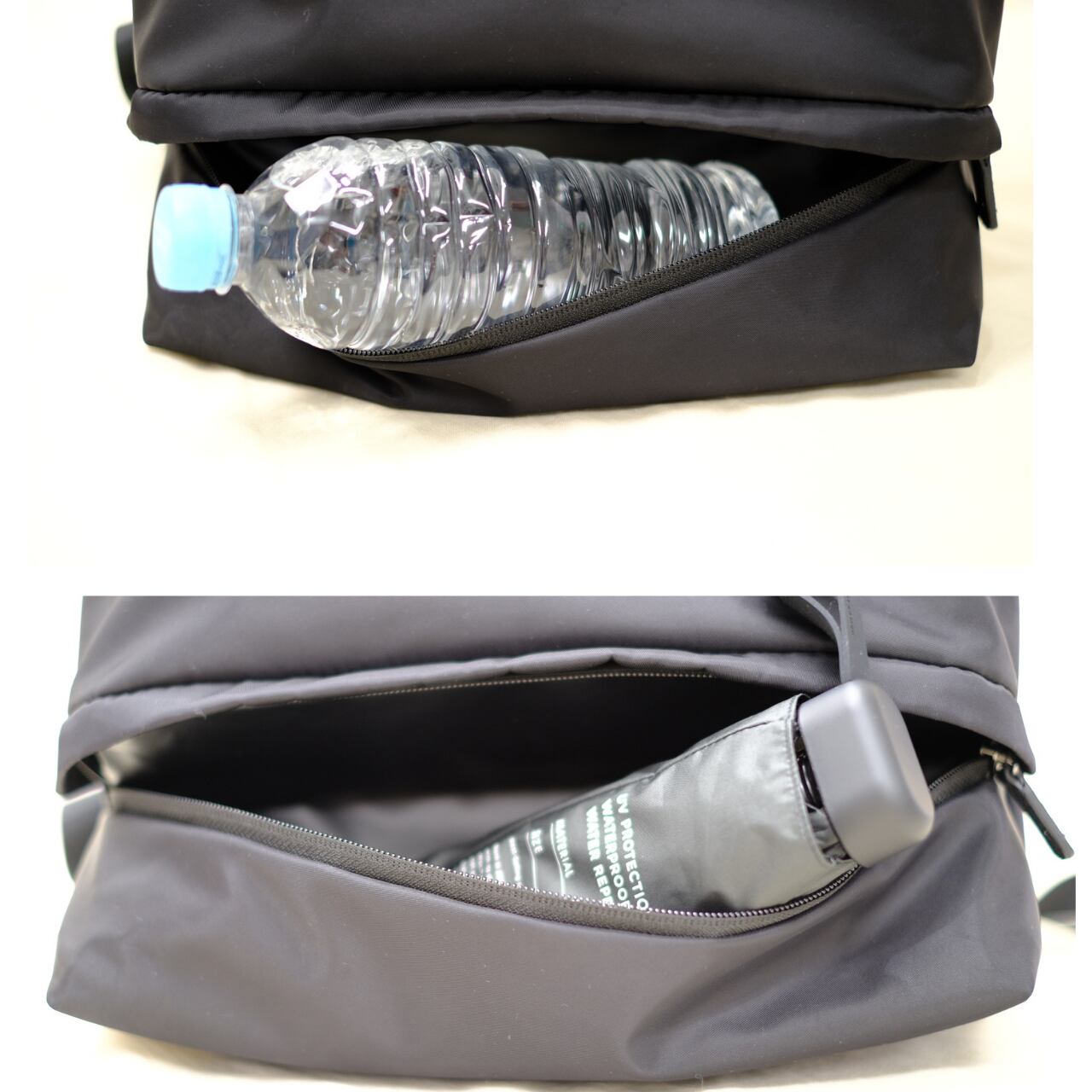 3段目には防水生地を使用しています。濡れた傘やペットボトルなど入れることができます。