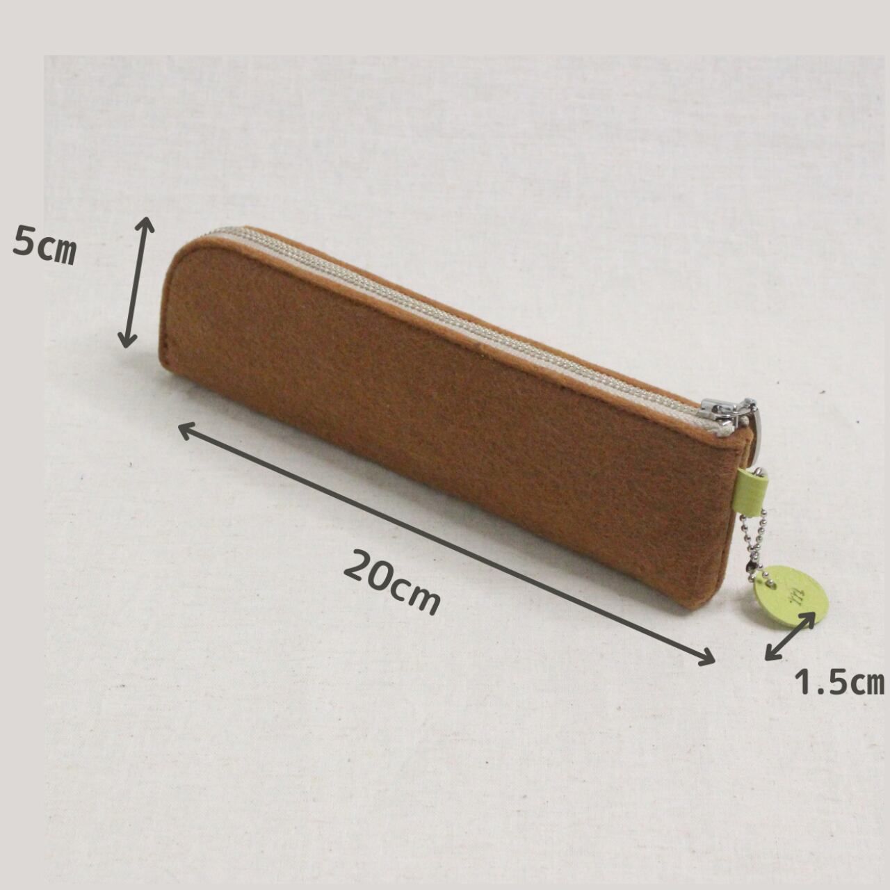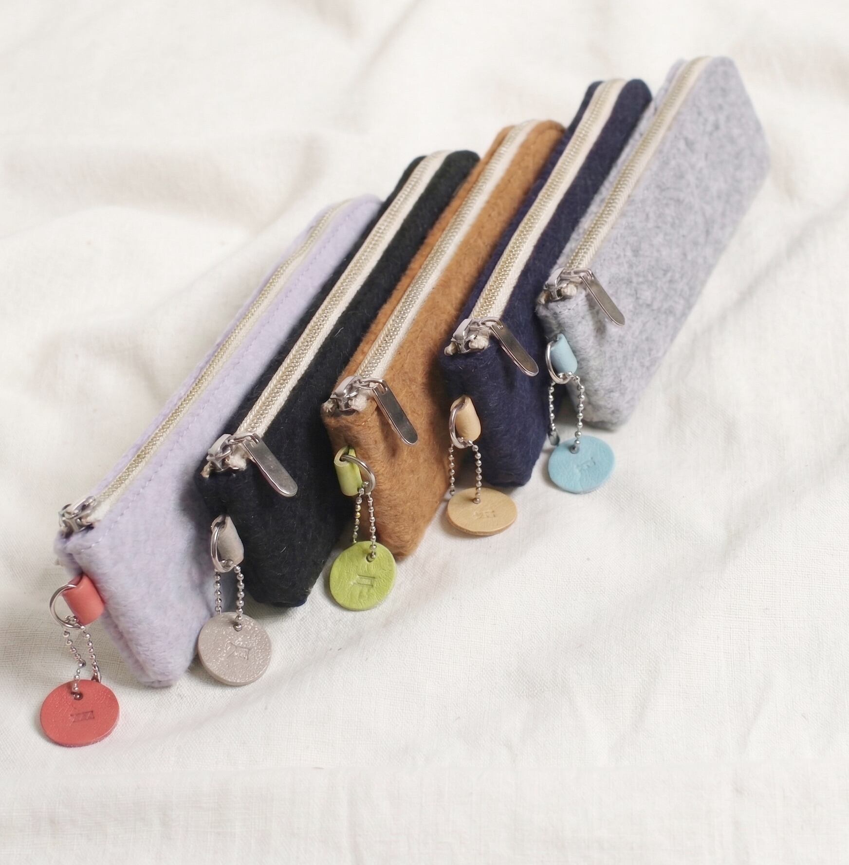 シンプルでおしゃれなフェルトペンケース 小さな丸い革のチャ-ムがアクセント
