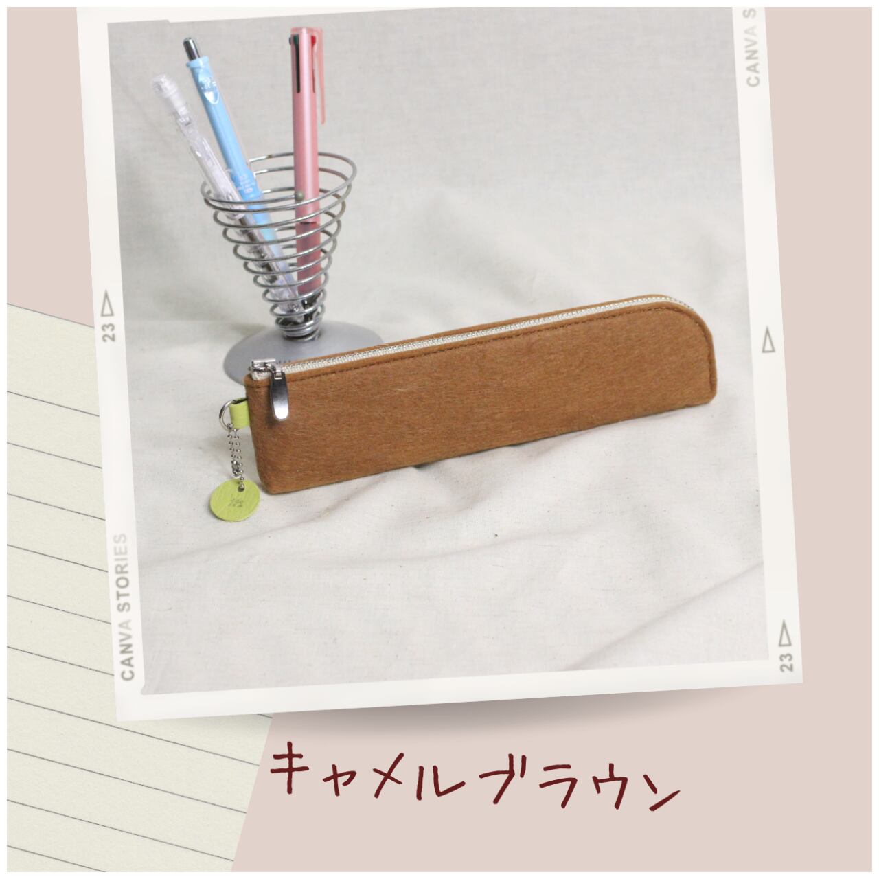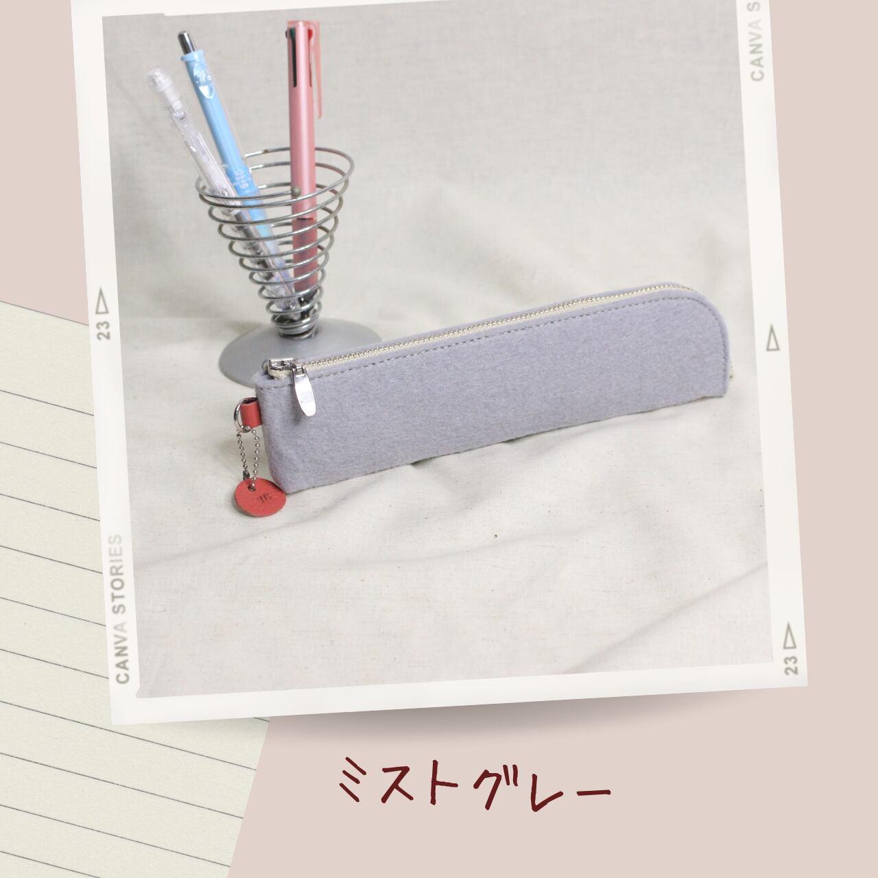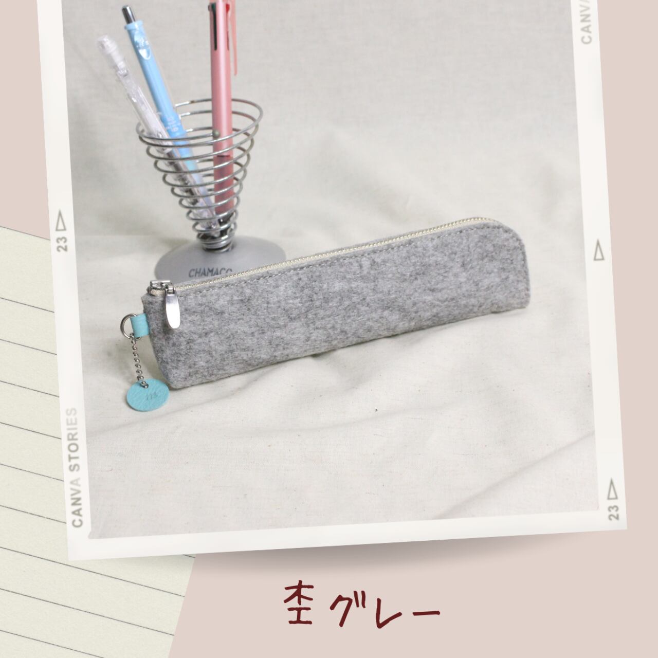 フェルトで、できたシンプルなデザインのペンケースに、革の小さな丸いチャームが アクセントになります。