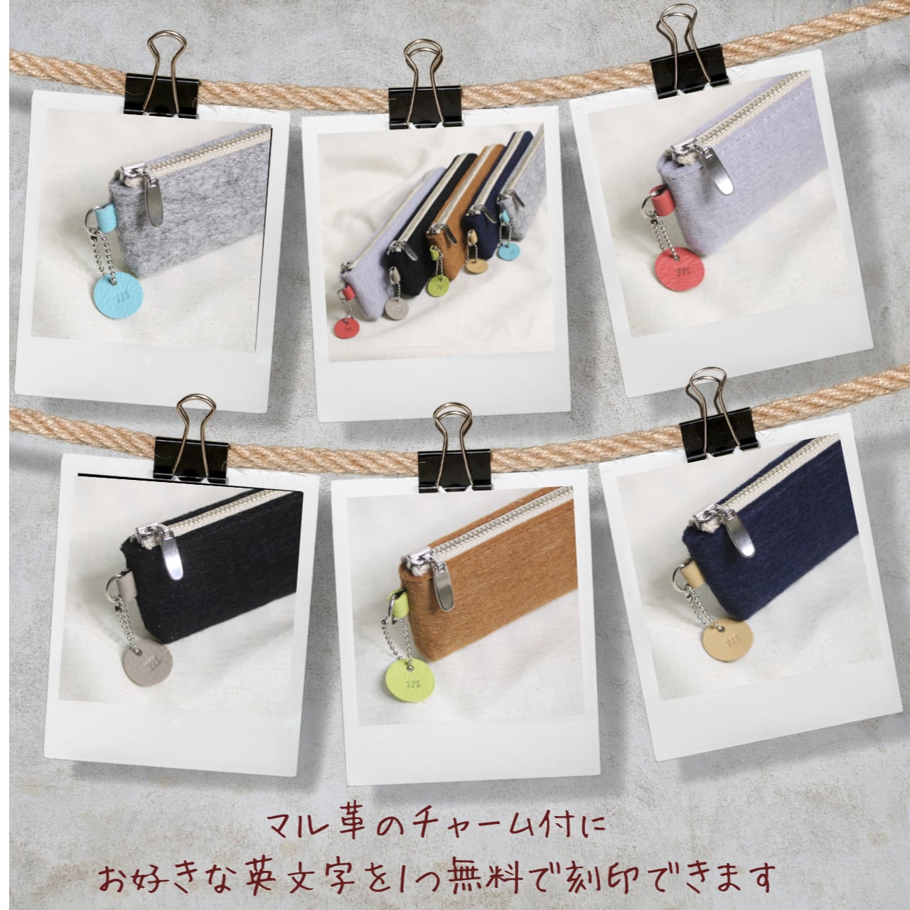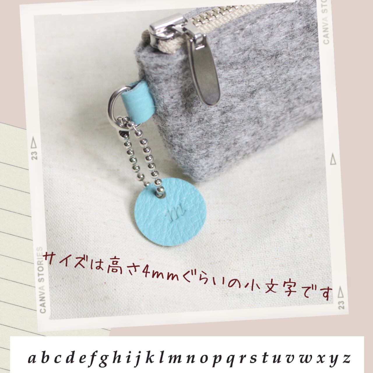 この革チャームに お好きな文字を1つ無料で刻印させていただきます。