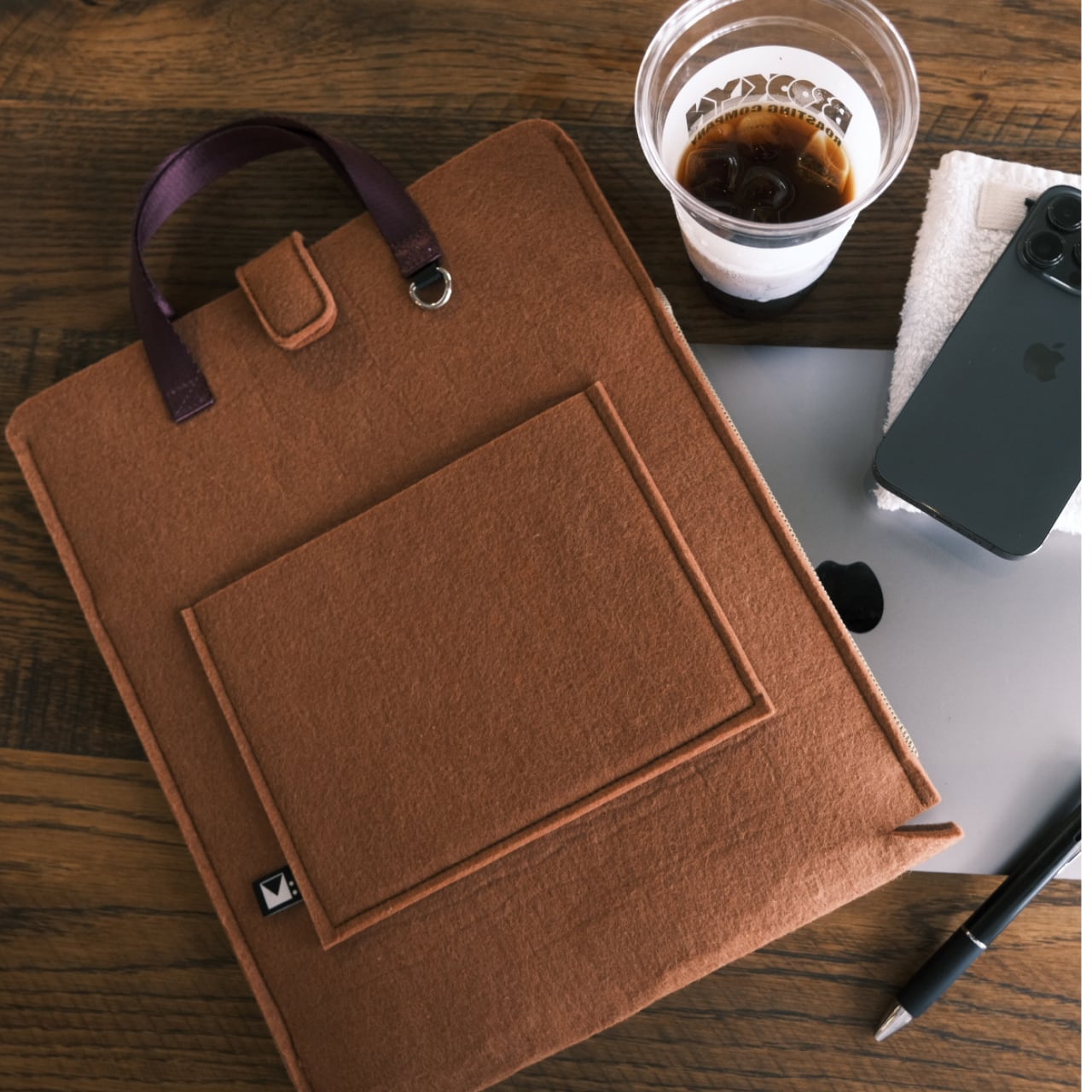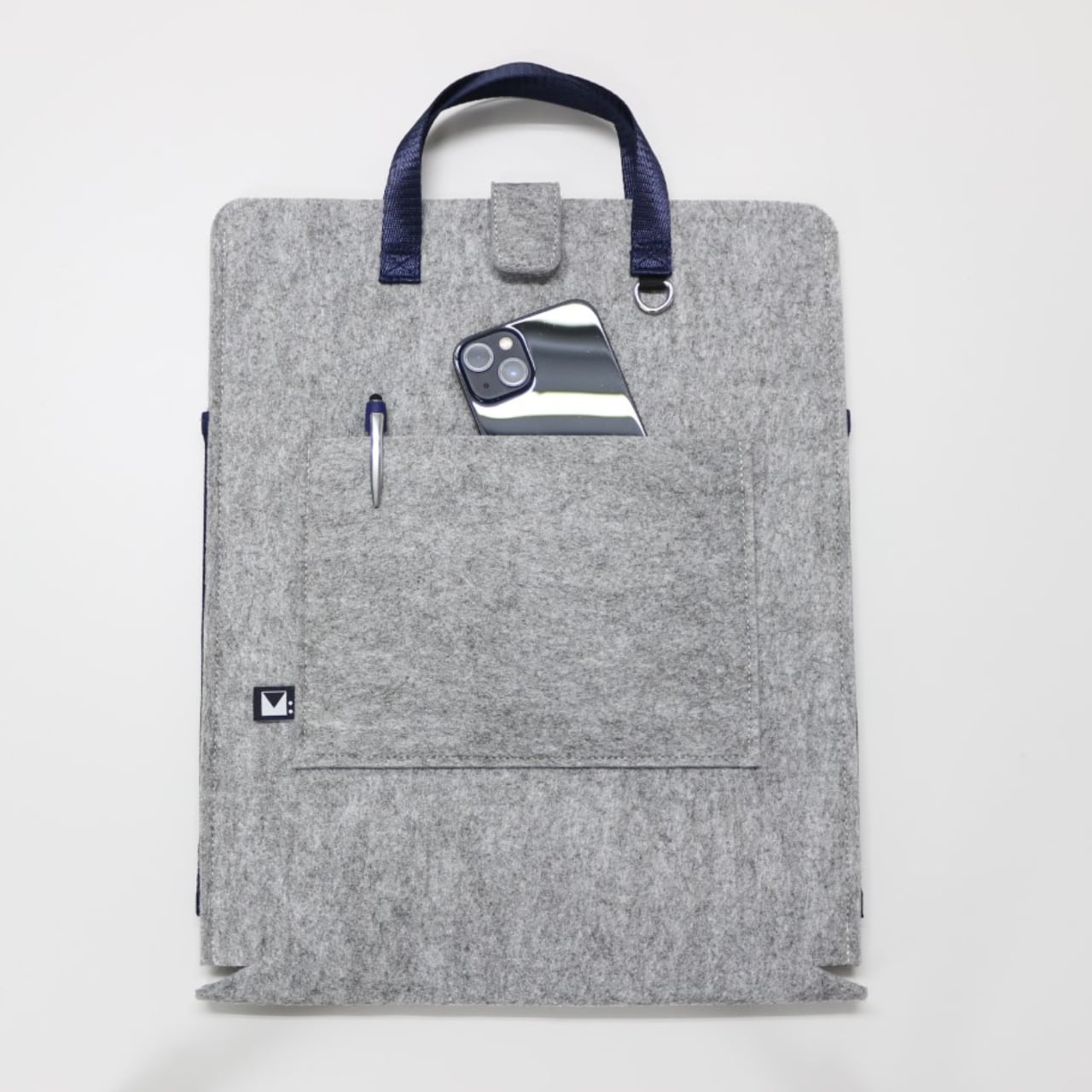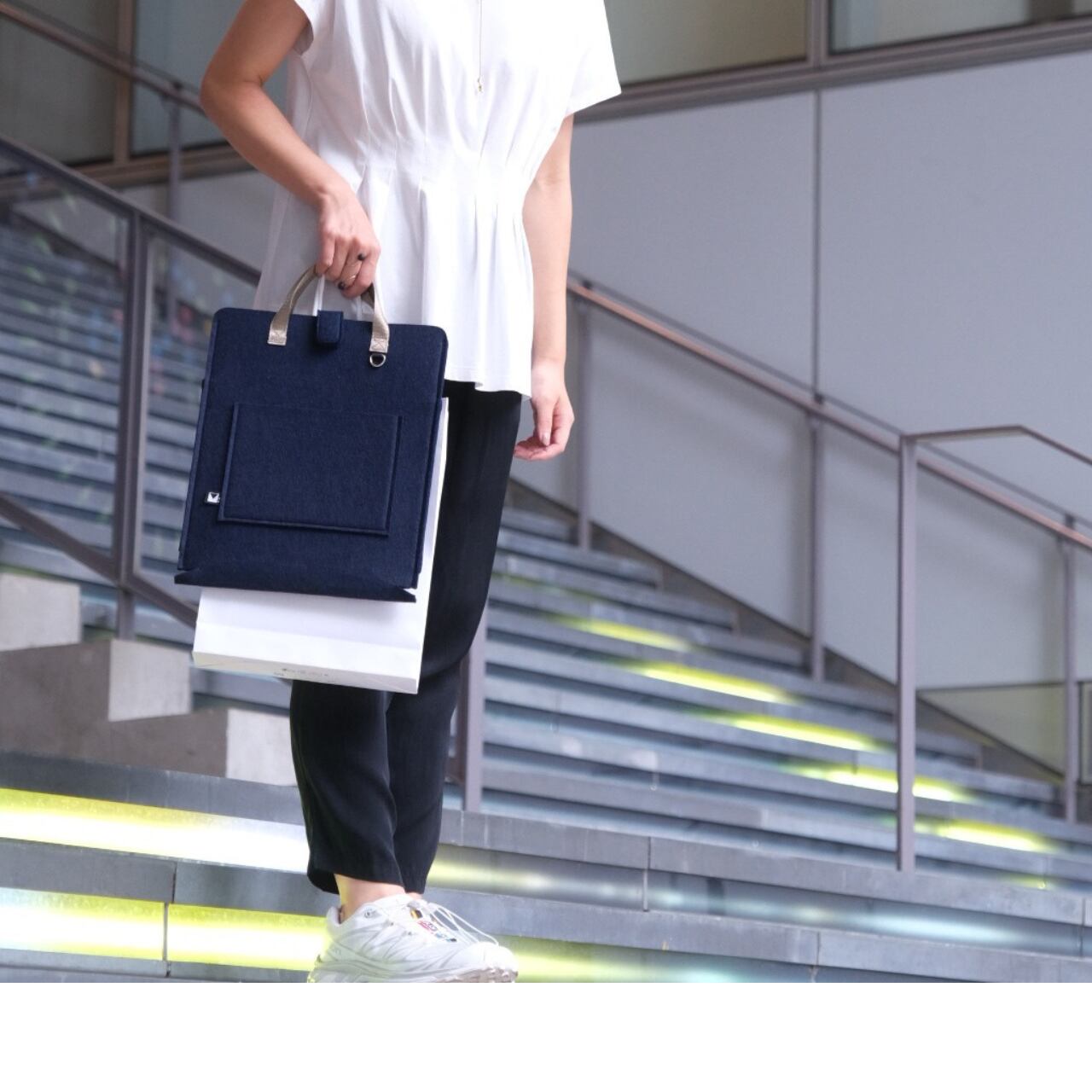 厚み3㎜のフェルト生地を使用していて、マチ幅はお手持ちのラップトップの厚みに合わせて自在に対応する構造になっており、重さは約170gで軽量です。スリムなバッグインケースとしてもご利用いただけます